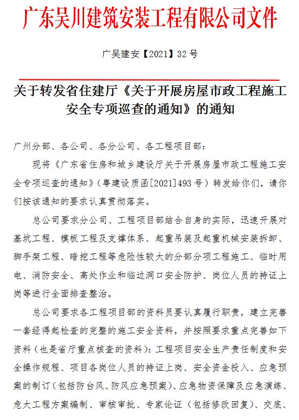 (二)安全專項(xiàng)巡查將從工程基本情況、安全管理行為、強(qiáng)制性條文、模架腳手架、起重機(jī)械、基坑開挖支護(hù)、安全防護(hù)等方面開展檢查。請(qǐng)各市務(wù)必將本通知要求傳達(dá)到轄區(qū)房屋市政工程參建各方,通知項(xiàng)目參建各方做好準(zhǔn)備工作,開展自查自改,認(rèn)真按要求配合安全專項(xiàng)巡查。發(fā)現(xiàn)故意阻撓、妨礙、干擾安全專項(xiàng)巡查工作的工程項(xiàng)目,將如實(shí)記錄,公開曝光。