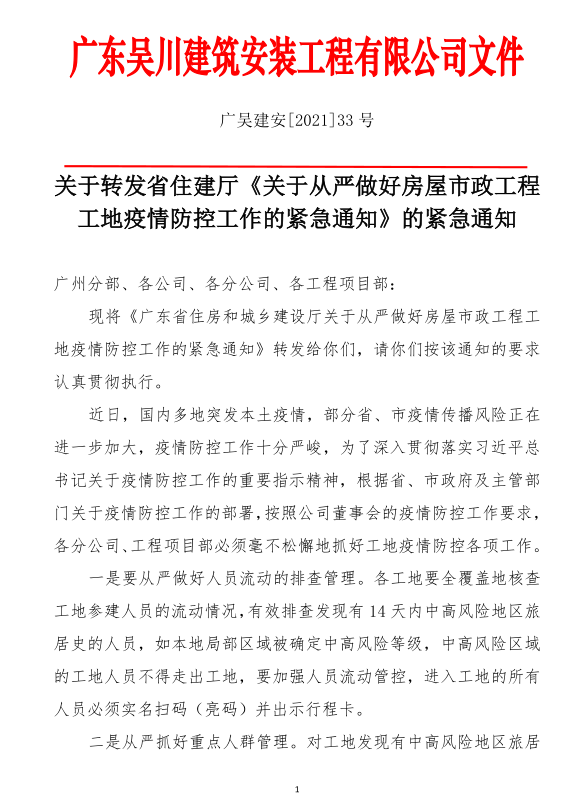近期,國內多地突發本土疫情,江蘇宿遷、湖北武漢等地建筑工地已出現新冠肺炎確診病例,疫情在工地傳播的風險進一步加大。為深入貫徹落實習近平總書記關于疫情防控工作的重要指示精神,根據省委、省政府關于疫情防控的工作部署,按照全省疫情防控和安全生產電視電話會議要求,我廳決定在認真執行2020年2月印發的《廣東省房屋市政工程工地防控新冠肺炎疫情工作指引》的基礎上,對部分常態化疫情防控措施進行提檔升級,提出了以下9方面要求。請結合本地區工作實際認真貫徹落實,毫不松懈地抓好房屋市政工程工地疫情防控各項工作。